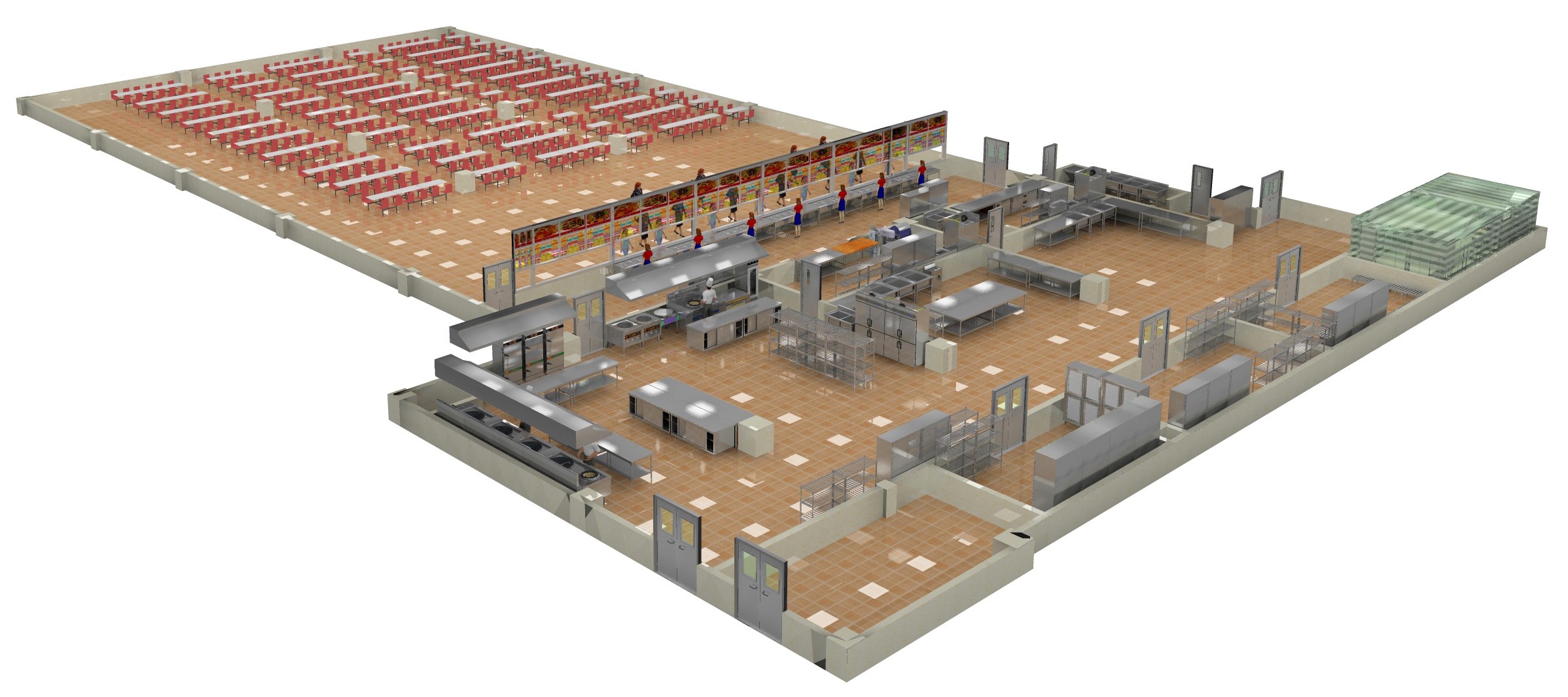 副食加工的流程:副食库→副食粗加工间→热菜间→凉菜间→备餐间→出餐口→餐厅。主食加工的流程:主食库→主食粗加工间→主食熟制加工间→备餐间→出餐口→餐厅。洗碗间要设在收残口,备餐间要设在出餐口,热菜间与凉菜间要紧靠备餐间,出菜顺畅方便。