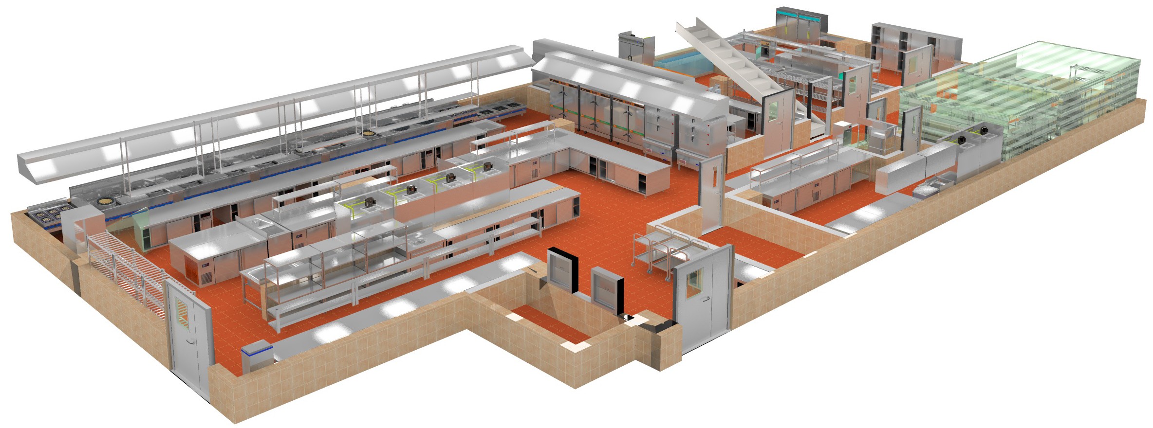 根据食材的处理流程,厨房工程布局设计应遵循以下流程:贮藏、粗加工、副食加工、主食加工、凉菜加工 、售饭间、洗碗消毒间等。厨具布置应结构紧凑,减少操作距离,能满足设备共享或集中处理垃圾,效率较高。还应遵守各工作岗位的次序,防止人员工作流程交叉,人员出入口与物料、垃圾等出入口应分开设置。