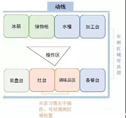 在平面图上看动线,灶具、操作台、冰箱、出餐口、餐盘回收窗口等布置看似很合理,但工作起来的厨房却十分混乱。