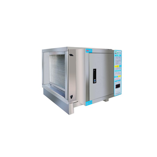低空油烟净化器为双区式静电吸附型,用来去除细微粒径油烟分子和其它空气中的杂粒。双区式是指内部电场的高压电离区与低压吸附区,气体中的油烟微粒在经过电场的高压电离区时,油烟分子会被电离并带有正或负电荷;之后经过低压区时,将会因电场力的效果而吸附在极板上,流向集油槽。