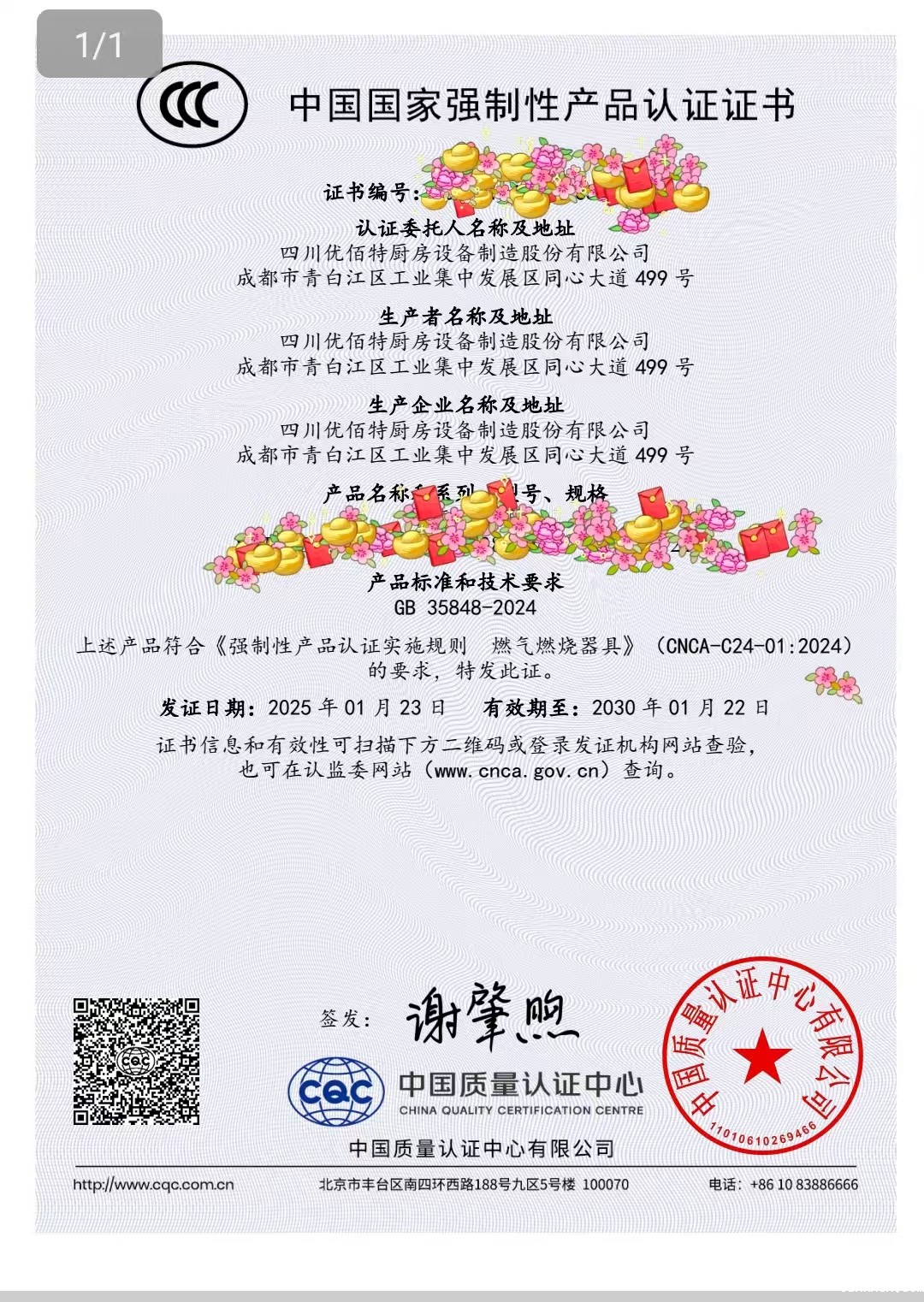 热烈祝贺我司获得商用炉灶3C强制认证证书